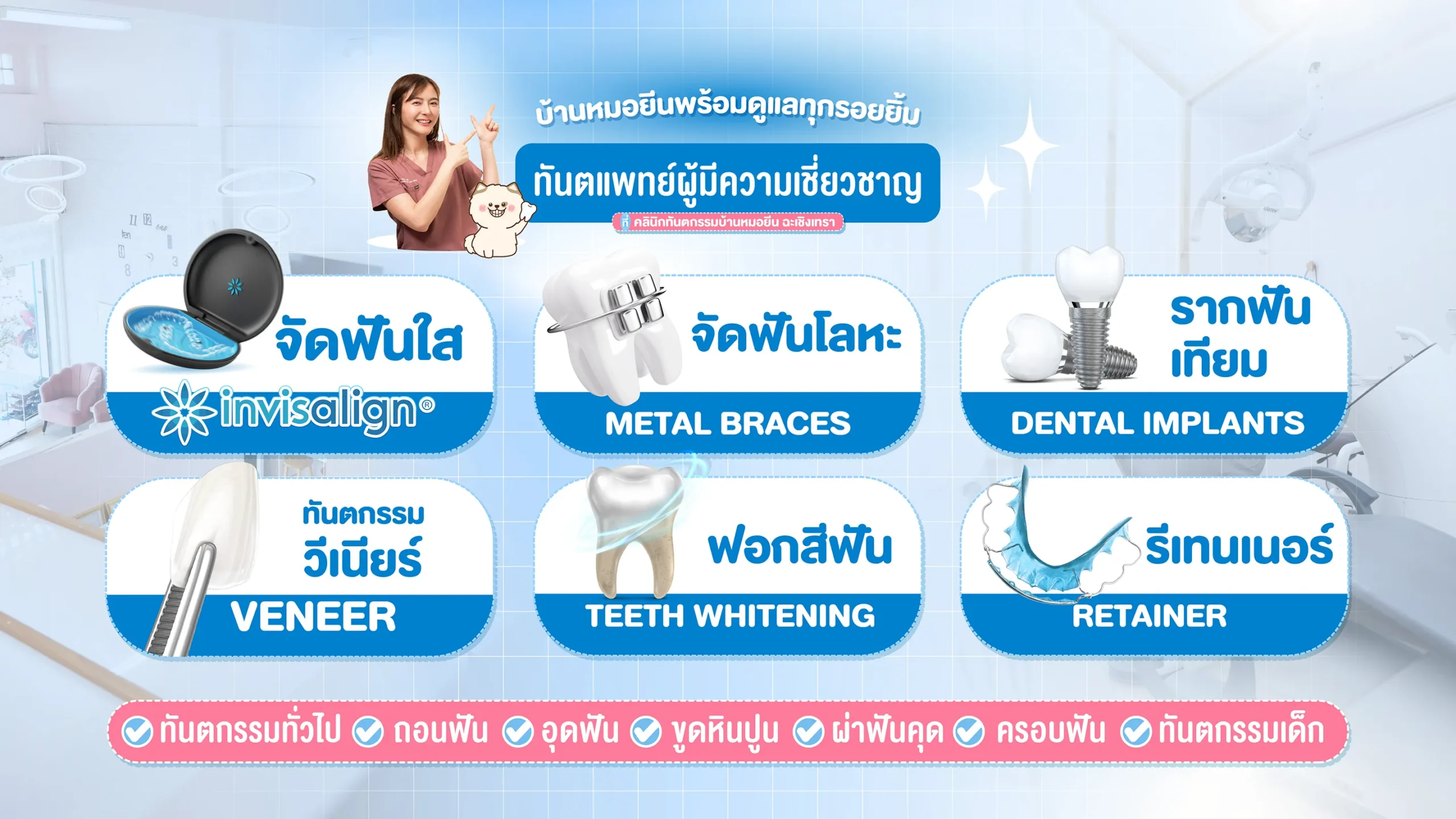 เลือกทำฟันกับทันตแพทย์มากประสบการณ์ พร้อมรับคำปรึกษาเฉพาะบุคคลกับทันตแพทย์เจ้าของเคสโดยตรงจัดฟัน ทำรีเทนเนอร์ วีเนียร์ รากฟันเทียม ครอบฟัน ฟอกสีฟัน ผ่าฟันคุด และทันตกรรมทั่วไป